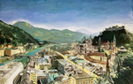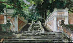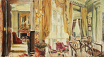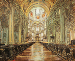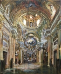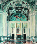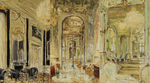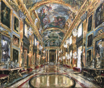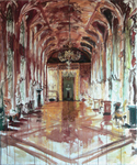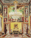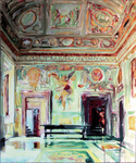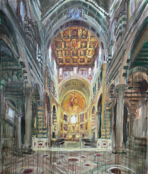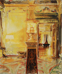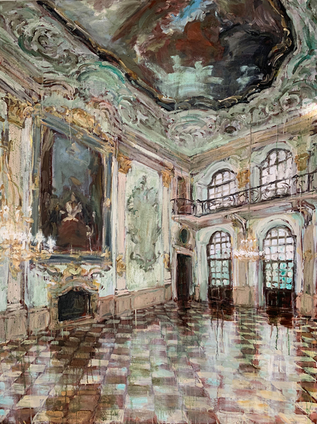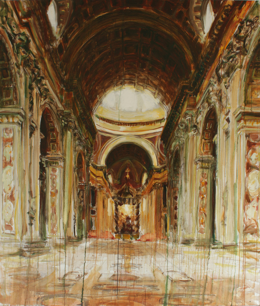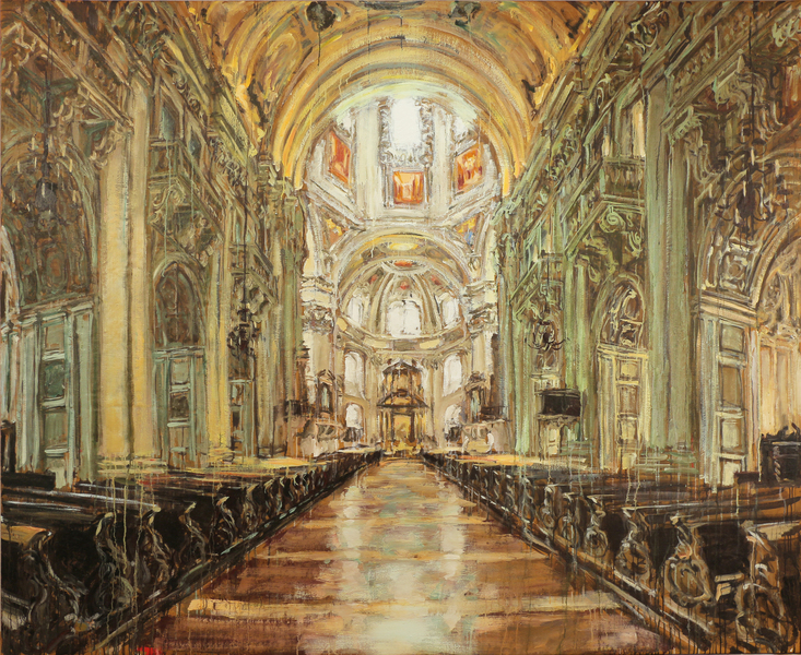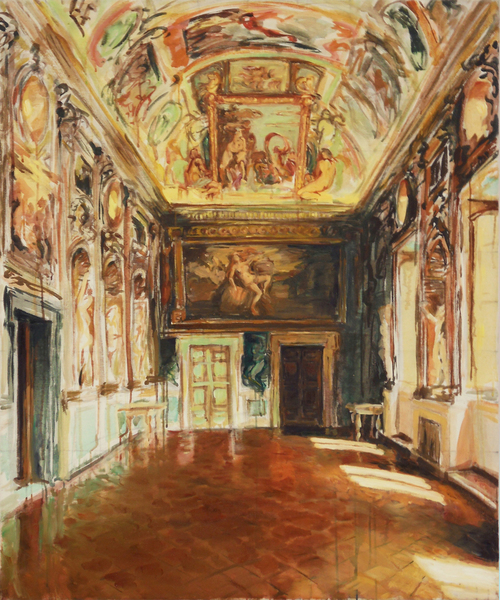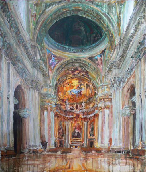 Superficially the pictures with brief, almost gestural brush ductus show historical interiors near to reality. Nevertheless, behind it an exploration of the nearly physically perceptible three-dimensionality takes place, operating with synethetical qualities too. In the church rooms seems discernibly an incense smell and the sound of wide halls, in the palace rooms the splendour struggles with morbidity, in the hotel rooms the fleetingness of the passing life is perceptible with quasi cinematic elements.